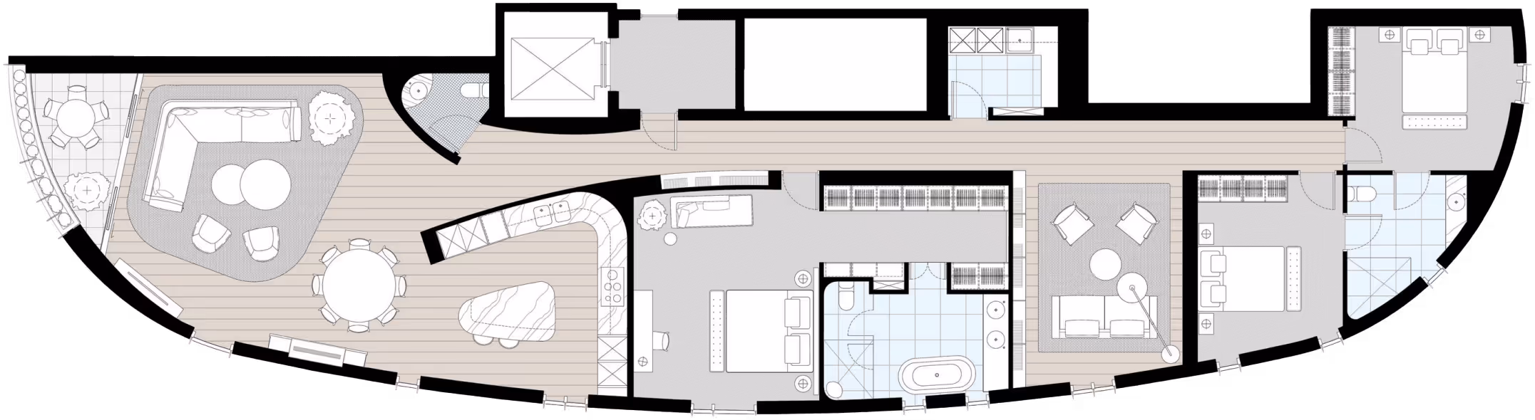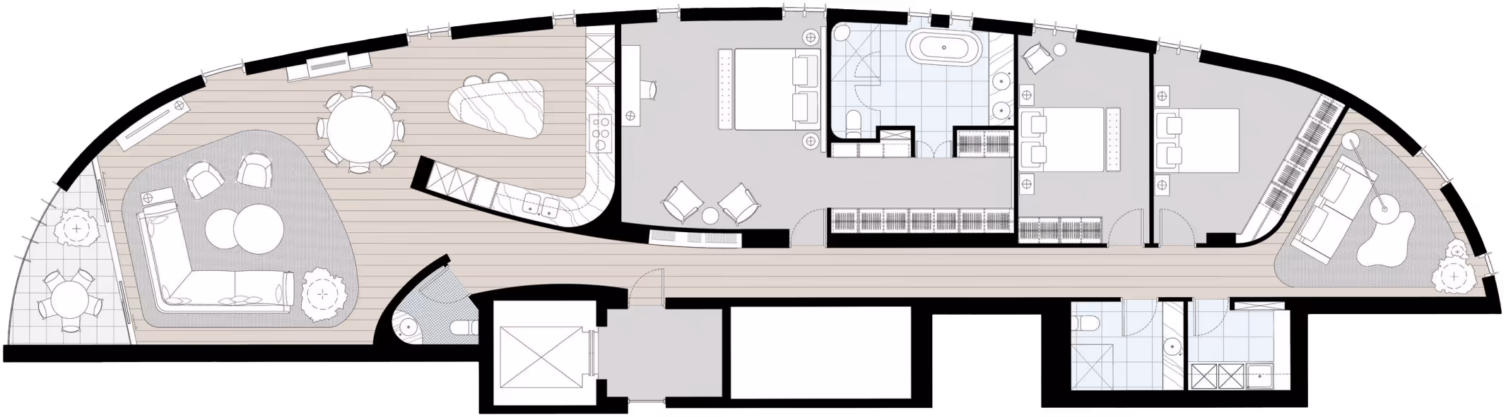 The Sub Penthouse Residence offers sweeping bay views and beautifully resolved interiors. Curved forms and full-height glazing bring light and movement into each space, while refined finishes and thoughtful proportions create a sense of quiet sophistication above the shoreline.